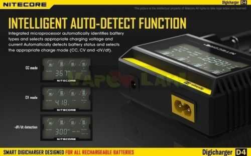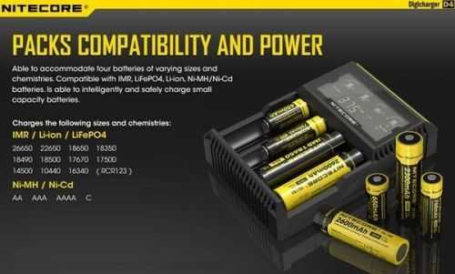 O Nitecore D4 é um carregador inteligente universal compatível com quase todas as pilhas recarregáveis cilíndricas, eliminando assim a necessidade de possuir vários carregadores. O D4 detecta automaticamente os tipos de pilhas Íon Lítio, Ni-MH e Ni-Cd. Por meio da seleção manual também é capaz de carregar pilhas LiFePO4. Circuito de carregamento inteligente seleciona modo de carregamento ideal (CC, CV e dV / dt) para cada pilha e os quatro compartimentos de carregamento são controlados por microcomputadores da D4 que monitoram e carregam as pilhas de forma independente. Além disso, um tela LCD digital integrada exibe claramente o progresso de carregamento, tensão, corrente e tempo. Possui desligamento automático.