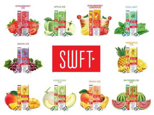 A SWFT é um dispositivo vape descartável pré-cheio com 1,3 ml de 5% ou 50 mg de sais de nicotina. O dispositivo possui uma bateria de 280 mAh e um mecanismo de disparo de desenho automático.